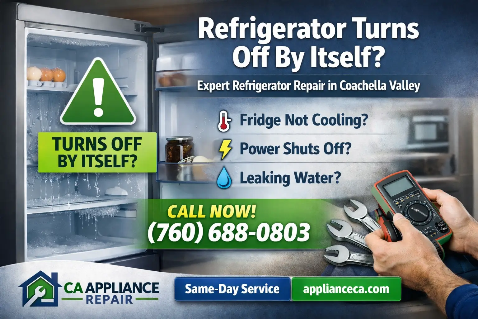 Call CA Appliance Repair at (760) 688-0803 to schedule service. If your refrigerator keeps turning off, don’t wait until it stops cooling completely — prompt refrigerator repair can save the compressor, prevent food spoilage, and avoid costly replacement.